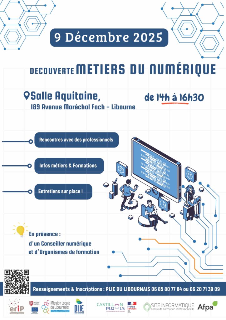 Le PLIE du Libournais organise un après-midi dédié aux métiers et aux formations du numérique. 📅 Mardi 9 décembre 2025⏰ 14h – 16h30📍 Salle Aquitaine, 189 Avenue Maréchal Foch – Libourne Au programme :✔️ Informations sur les métiers et les parcours de formation✔️ Rencontres avec des professionnels du secteur✔️ Entretiens sur place✔️ Présence d’organismes de […]